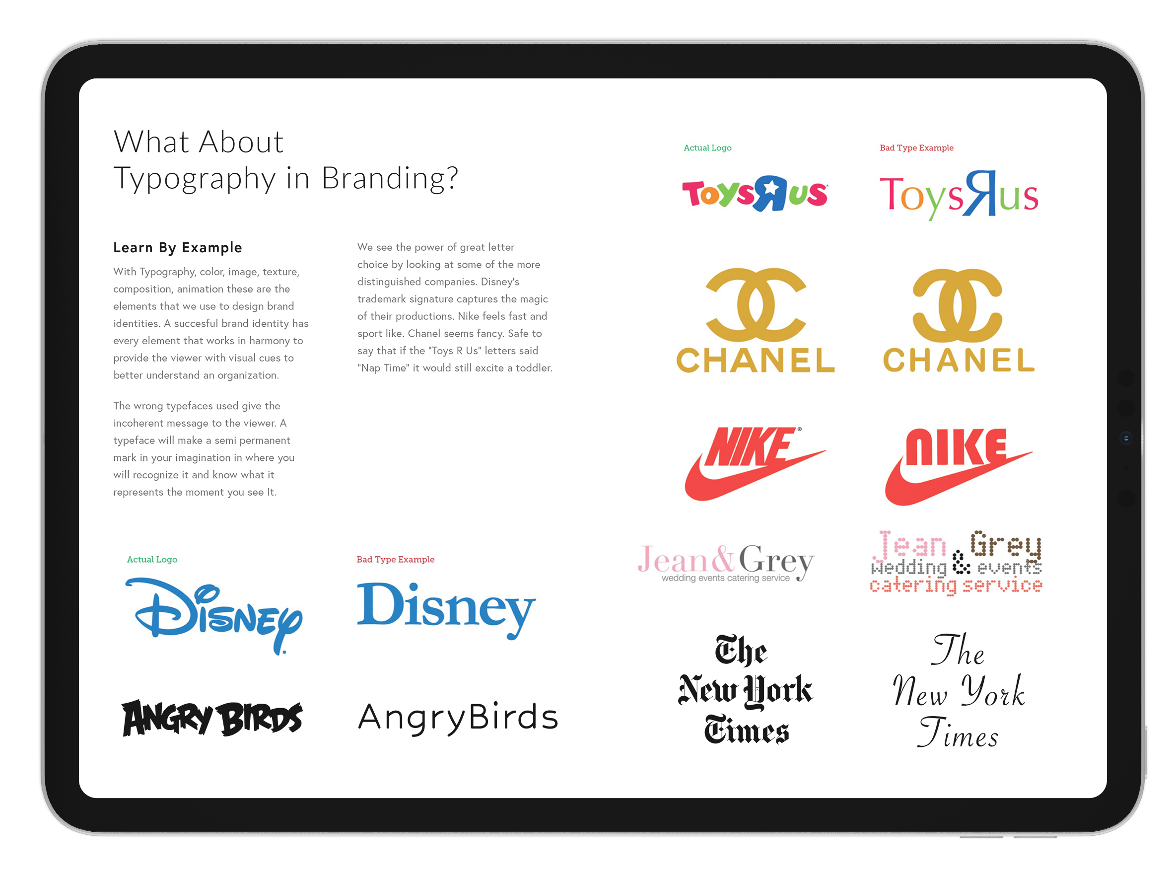 The selection of typefaces and how they are treated is critical when designing. Choose the right typeface not only gains customer’s trust, but it can also impact engagement. We all recognize Nike in bold italics which implies a bold brand moving forward fast through innovation of athletic wear.